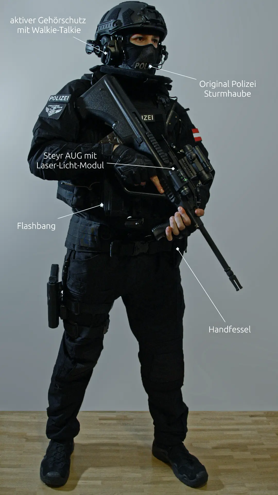 Unsere Einheit ist keine Einheit der österreichischen Polizei und hat nichts mit der Cobra, WEGA, dem BKA oder BMI zu tun. Es handelt sich um eigene Ausrüstung zur szenischen Darstellung für Film und TV.